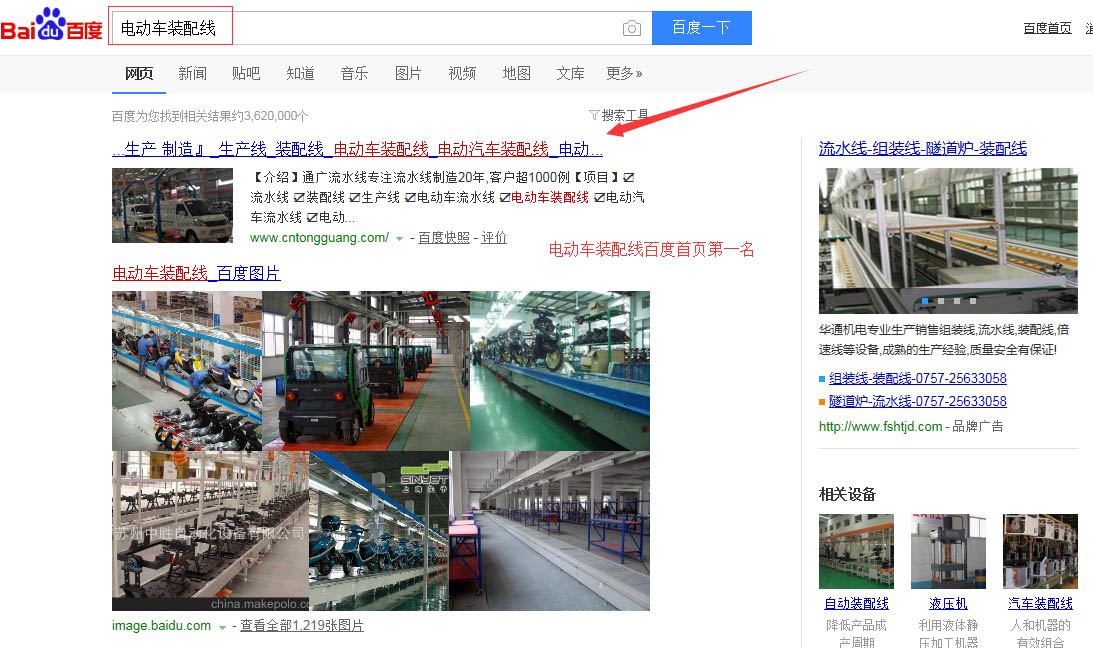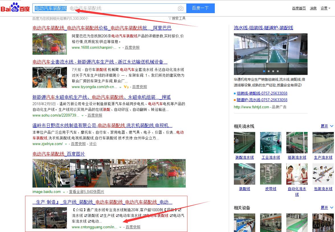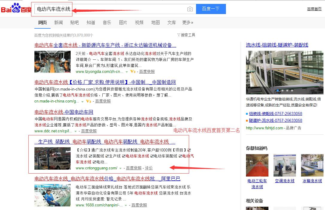 “電動車裝配線”百度首頁第一名,請看下方截圖 ,“電動車流水線”,“電動汽車流水線”,“電動汽車裝配線”,等等,很多關鍵詞都在百度首頁,請看如下截圖,有圖為證。在此特意感謝臺州SEO(通盛網絡)人員為我公司網站所做的付出與努力